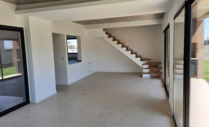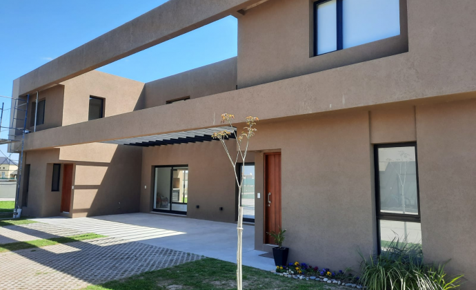 La casa de estilo moderno esta construida en hormigón. Posee ingreso doble, planta baja, primer piso, más jardín con espacio para piscina.
